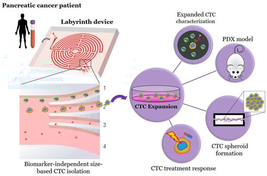 Recently, we developed and optimized a high-throughput, label-free microfluidic device, the “Labyrinth”, for the size-based isolation of CTCs [33]. The Labyrinth has demonstrated greater than 90% recovery when tested with various cell lines, including pancreatic cancer cell lines, while achieving an 89% white blood cell (WBC) removal [33]. In our approach, since no positive or negative selection of cells is needed, the Labyrinth enables the study of CTC heterogeneity, and allows for the identification of multiple CTC subpopulations through further downstream biological and functional studies. Our previous study showed the presence of CTCs that have undergone the epithelial-to-mesenchymal transition (EMT) across all pancreatic cancer patients [33]. The use of our label-free Labyrinth device enables the study of viable EMT-like CTCs, which are believed to be the most aggressive subtype of CTCs [34,35,36]. Building upon our previous expansion work on lung cancer, this study uses the Labyrinth to expand CTCs using a monoculture approach to maintain the simplicity of the Labyrinth by eliminating the need of CTC purification from other cell lines.