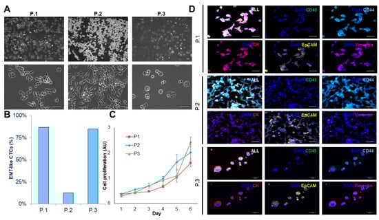 Characterizing CTC-derived cell lines. (A) Brightfield images (10× and 40×) of expanded CTC cultures. (B) Percentage of epithelial-to-mesenchymal transition (EMT)-like CTC in adherent cultures. (C) Growth curve analysis of adhered CTC cultures (n = 3). (D) Representative images of immunofluorescence staining using cytokeratin (red)/vimentin (magenta)/CD44 (light blue)/CD45 (green)/DAPI (blue). (Scale bar = 50 µm).