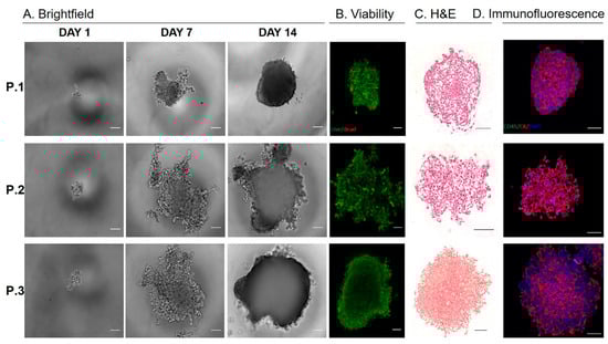 Pancreatic cancer CTC lines were cultured in 10% fetal bovine serum and 1.5× antibiotics supplemented RPMI till 60%–70% confluency. Cells were removed from culture surfaces by gentle trituration and collected in conical tubes. Pancreatic CTC spheroids were generated on 384 well hanging drop array plates, following extensively established protocols [37,38,39,40]. Briefly, cell suspensions were adjusted such that 20 µL contained 100 pancreatic CTCs. Spheroids were initiated with 100 cells/drop, and allowed to aggregate and form within the hanging drop array matrix. Progression of spheroid formation was observed using live phase contrast microscopy, over a period of 14 days, with daily monitoring. Medium was supplemented every other day in 1–2 µL increments, to maintain a drop volume of 20 µL, as described previously. Calcein-AM and Ethidium homodimer staining was utilized to monitor viability of cells within pancreatic CTC spheroids, following protocols described previously [41]. Cells were imaged using an inverted Olympus IX-81 spinning disk confocal microscope (Olympus Life Sciences, Waltham, MA, USA), where the presence of green indicated live cells, and red fluorescence indicated dead cells.