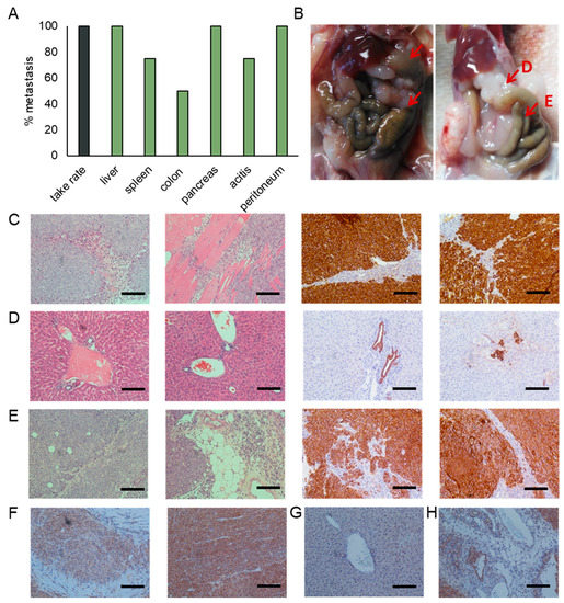 We observed the appearance of tumors in all injected mice 3–4 weeks after the injection of 106 cells (Figure 5A). Tumors were harvested when the tumor size reached the humane end point. At that time, we observed widespread metastasis from the subcutaneous injection side to a number of organs, including the liver, peritoneum, and pancreas, as well as the development of ascites (Figure 5A,B). Immunohistochemistry shows cytokeratin positive subcutaneous tumors of pancreatic morphology that display large areas of tumor-associated stroma and invasion into the peritoneum (Figure 5C).