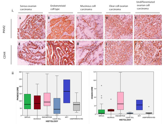 (i) Immunohistochemical (IHC) representative staining of PKM2 in the cytoplasm and of CD44 mainly in cell membranous and in cytoplasm in different histological subtypes of EOC tumor tissues (magnification 200×). (A) PKM2 and (F) CD44 staining in serous ovarian carcinoma. (B) PKM2 and (G) CD44 staining in endometroid cell type. (C) PKM2 and (H) CD44 protein expression in mucinous cell carcinoma. (D) PKM2 and (I) CD44 in clear cell ovarian carcinoma. (E) PKM2 and (J) CD44 expression in undifferentiated ovarian cell carcinoma. (ii) Boxplots showing PKM2 and CD44 protein expression distribution by different histology subtypes of ovarian carcinoma specimens (Wilcoxon rank test p-value = 0.004 for CD44 and p-value = 0.540 for PKM2 protein expression). PKM2: pyruvate kinase M2; EOC: epithelial ovarian cancer; *: extreme outliers.