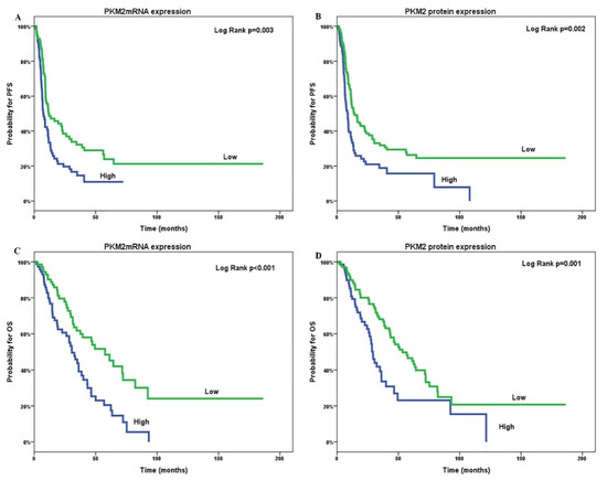 Tumoral PKM2mRNA (A,C) and protein expression (B,D) associated with progression-free survival (PFS; A,B) and overall survival (OS; C,D) of patients with epithelial ovarian cancer. PFS: progression-free survival; OS: overall survival.