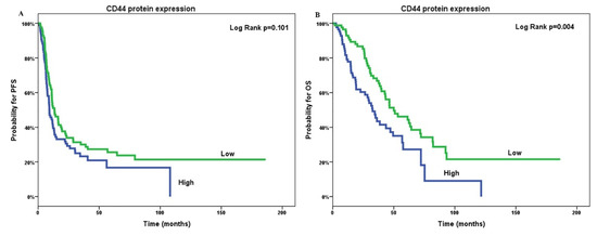Correlation of tumoral CD44 protein expression (A,B) with overall survival (OS; A) and progression-free survival (PFS; B) of patients with epithelial ovarian cancer. OS: overall survival; PFS: progression-free survival.