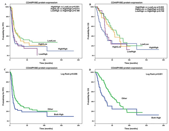 To further investigate the role of PKM2 and CD44 tumoral expression on patients’ outcome, we analyzed patients according to the combined expression for both PKM2 and CD44. Patients with low PKM2/CD44 protein expression levels experienced significantly increased PFS (mPFS; 16.5 versus 7.4; p = 0.003, Figure 5a) and OS (mOS; 61.3 versus 22.7; p = 0.001, Figure 5b) compared with patients with high PKM2/CD44 tumoral expression. In addition, patients with PKM2 high/CD44 low expression appeared with increased PFS and OS compared with PKM2 high/CD44 high patients (mOS8, 5 versus 7.4; p = 0.749 and 30.6 versus 22.7; p = 0.185) but without statistically significance (Table 2). However, CD44 high/PKM2 low patients showed significantly better PFS and OS compared with PKM2 high/CD44 high group.