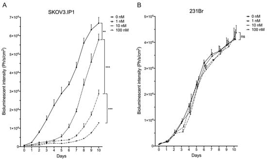 In vitro trastuzumab-mediated growth inhibition of (A) SKOV3.IP1 cells, naturally expressing high HER2 levels and (B) 231Br cells, stably transfected to express high levels of HER2. Cells were cultured with different trastuzumab concentrations from day 0–5, followed by trastuzumab-free medium at day 6–10. Concentration-dependent growth inhibition can be observed for SKOV3.IP1 cells during trastuzumab treatment. 231Br cell growth was not hampered, regardless of trastuzumab concentration. (ns: not significant, ** p < 0.01, *** p < 0.005).