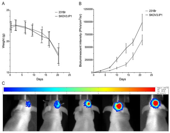 Athymic nude mice were inoculated intracranially with SKOV3.IP1 or 231Br cells. Weight loss was minimal during the first 17 days after inoculation, before onset of significant weight loss occurred around day 21 (Figure 2A). Tumor growth was monitored using in vivo BLI after intraperitoneal injection of D-luciferin (Figure 2B,C). Both SKOV3.IP1 and 231Br orthotopic tumors show exponential growth characteristics.