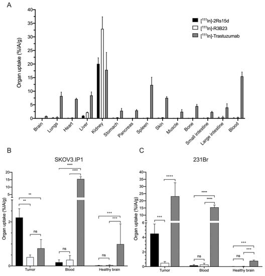 Ex vivo biodistribution of radiolabeled anti-HER2 tracers in brain tumor-bearing mice. (A) Ex vivo biodistribution analyses of [111In]-labeled compounds in HER2pos tumor-bearing mice, at 1 h p.i. (sdAbs) and 3 d p.i. (mAb) (n = 4). For sdAbs only kidneys show elevated uptake, whereas trastuzumab has increased tracer uptake in all highly vascularized organs. Detail of tracer uptake in tumor, brain and blood shows a significantly higher tumor uptake for [111In]-2Rs15d in (B) SKOV3.IP1 and (C) 231Br brain tumors compared to the non-targeting [111In]-R3B23. Increased tumor-to-brain ratio of [111In]-trastuzumab was only observed in 231Br tumors (C). (ns: not significant, ** p < 0.01, *** p < 0.005, **** p < 0.001).