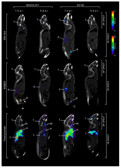 Sagittal view of fused whole-body and brain-focused µSPECT/CT scan images of anti-HER2 [111In]-2Rs15d, non-targeting [111In]-R3B23 and anti-HER2 [111In]-trastuzumab 1 h and 3 days p.i. in SKOV3.IP1 (Left) and 231Br (Right) tumor models. One representative image of each group (n = 4) is shown. Tumor-targeting is visible for [111In]-2Rs15d in both tumor models, whereas [111In]-trastuzumab was only able to accumulate in 231Br tumors. High uptake was also observed in highly vascularized organs up to 3 days after injection. There was no aspecific leakage of non-targeting [111In]-R3B23 into the tumor site. T: tumor, Bl: blood, K: kidney, H: heart, L: liver, B: bladder, TB: total body, BF: brain focus.