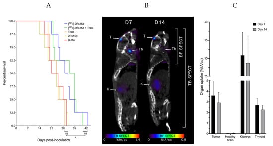 Event-free survival during TRNT. Events were defined as (i) mortality, (ii) weight loss > 20%, (iii) immobility, (iv) unresponsiveness to external stimuli. 231Br tumor-bearing mice (n = 8 per group, tumor inoculation on Day 0) were treated with intravenous injections of [131I]-2Rs15d (Day 7, 14), combination treatment of [131I]-2Rs15d (Day 7, 14) and trastuzumab (Loading dose; day 7-maintenance dose; day 10, 14, 17, 21, 24, 28) or trastuzumab as single agent (Loading dose; day 7-maintenance dose; day 10, 14, 17, 21, 24, 28). Control groups received either vehicle buffer or unlabeled 2Rs15d in equimolar quantities as treated groups at identical timepoints (A). 231Br tumor-bearing mice (n = 3, tumor inoculation on Day 0) received [131I]-2Rs15d (Day 7, 14), followed by µSPECT/CT imaging 2 h p.i. Fused µSPECT/CT images (B) and image quantification (C) showed accumulation of activity in brain tumor, thyroid and kidneys. Trast: Trastuzumab, T: tumor, K: kidney, Th: thyroid, TB: total body, BF: brain focus (ns: not significant, * p < 0.05).