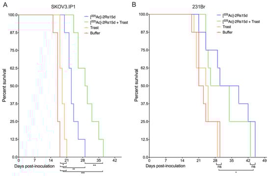 Event-free survival during targeted alpha therapy. Events were defined as (i) mortality, (ii) weight loss > 20%, (iii) immobility, (iv) unresponsiveness to external stimuli. Trastuzumab-sensitive SKOV3.IP1 (A) and trastuzumab-resistant 231Br (B) tumor-bearing mice (n = 8 per group, tumor inoculation on Day 0) were treated with intravenous injections of either [225Ac]-2Rs15d (Day 7, 10, 14), combination treatment of [225Ac]-2Rs15d (Day 7, 14, 21) and trastuzumab (Loading dose; day 7-maintenance dose; day 10, 14, 17, 21, 24, 28) or trastuzumab as single agent (Loading dose; day 7-maintenance dose; day 10, 14, 17, 21, 24, 28). The control group received vehicle buffer at identical timepoints as treated groups. 150 mg/kg gelofusin was co-administered with [225Ac]-2Rs15d in order to reduce kidney retention. (ns: not significant, * p < 0.05, ** p < 0.01, *** p < 0.005).