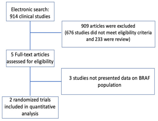 The combined search yielded 914 potentially relevant articles, 912 of which were excluded because they were either reviews, non-randomized controlled trials or had no data relating to the BRAF-mutant population. Two trials (RAISE and VELOUR study), with a total of 77 patients with BRAF-mutant CRC, were included (Figure 1).