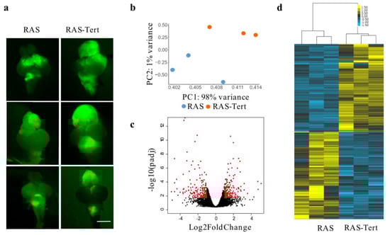 We previously established two isogenic models of juvenile brain tumors in zebrafish, that differs for the TMM adopted by cancer cells [20]. The two models are based on the somatic expression of the human oncogene HRASV12 in neural progenitor cells; the first model (called RAS) (Figure 1a, RAS) resembles the molecular mesenchymal subtype of glioblastoma [16] and uses ALT for telomere maintenance [20].