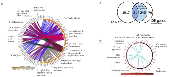 We then evaluated whether the 366 DE gene cohort was enriched for genes known to regulate telomere biology. For this purpose, we used the Telnet database, which contains a list of genes that have been reported to be involved in telomere maintenance mechanisms [21]. We established that the 17.3% of DE genes (51/296 DE genes with human orthologous) were listed in Telnet database (Figure 1f); we used the information provided by TelNet on gene-specific functions to classify the DE genes identified in our brain tumor models. We found that the most significant DE genes belonged to the category: DNA replication and chromatin organization, according to the Telnet database (Figure 1g and see Table S3).