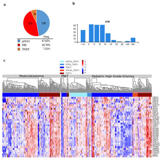 General features in paediatric brain tumor samples used for comparison (a) Pie chart depicting the tumor samples from the pediatric cBio Portal used in the analysis; (b) Diagrams showing the different ages of the patients from the pediatric cBio Portal; (c) Hierarchical clustering of the expression values of the genes of the Reactome pathway: “Activation of the pre-replicative complex” (Homo sapiens R-HSA-68962) in samples from the paediatric cBio Portal. The samples were divided per tumor type, according to the presence of mutations in H3F3A and/or ATRX, and TERT expression level (TERT+: Z-score > 0, TERT−: Z-score < 0).