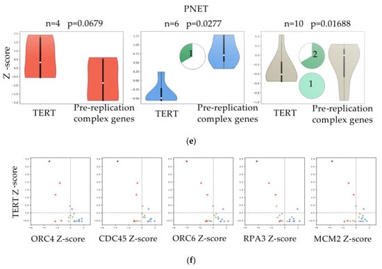 Mutations in H3F3A (pHGG n = 32; PNET n = 3) and ATRX (pHGG n = 24, PNET n = 1) reported for some samples were clustered in group 2 (low expression of TERT, high expression of the genes of the pathway) and group 3 (TERT Z-score close to 0, pathway Z-score close to 0) (Figure 3a,e). The profile of the five genes (ORC4, CDC45, ORC6, RPA3 and MCM2) found deregulated in zebrafish RAS-TERT vs. RAS tumors confirmed the presence of three different types of relationships: some tumors showed that when TERT was up-regulated (Figure 3b,d,f, Y-axis Z-score > 0) the five genes of the pre-replicative complex were down-regulated (x-axis Z-score < 0) and vice-versa; the third group of samples showed that when the levels of TERT were close to zero, also the five genes of the pathway were close to zero (Figure 3b,d,f).