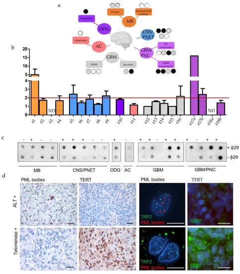 The World Health Organization (WHO) describes more than 100 categories and subtypes of primary juvenile brain tumours, according to their presumed cell of origin and histological classification [3]. The differences with the adult brain tumors, the intratumor heterogeneity and the young age of the patients make it hard to treat these tumors; this is mainly due to limited molecular markers that can be linked to response to treatment. In recent years, the discovery of unique biological drivers linked to ALT suggested promising strategies for the development of new powerful therapies. Recently, Next Generation genomic platforms identified common molecular features shared by different types of paediatric brain tumours [2,8,12]. Since 2016, the updated classification uses molecular parameters to define many tumour entities [13]. However, the study of TMMs adopted by different paediatric tumors remains challenging based on genomic, epigenetic and expression data. More accuracy on TMMs of paediatric brain cancer can be obtained by careful analysis of pathological specimens, including the combined staining for ALT-associated PML bodies (APB) [14] and TERT, but these approaches are still not enough as stainings are variable and their diagnostic value is unclear. More reliable for the diagnosis of ALT would be quantitative detection of DNA C-circles and telomere content [15]; however, a systematic analysis of these parameters in pathological specimens is not yet routinely performed; in addition, no treatments have been developed or proposed for ALT vs. telomerase positive tumors.