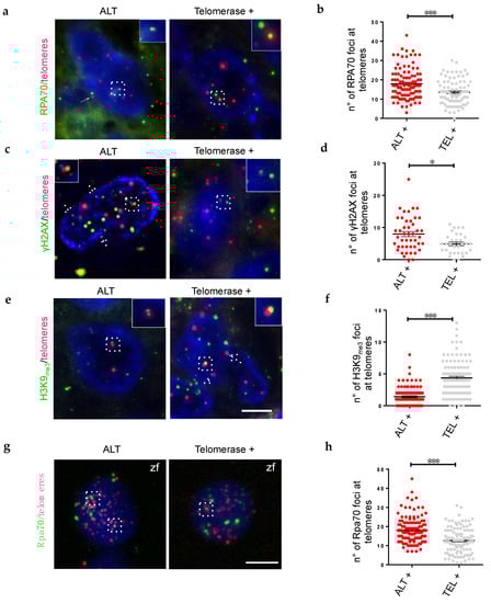 Our analysis of zebrafish brain tumors revealed a reduced expression of genes of the pre-replicative complex and an increased expression of genes driving heterochromatin deposition as hallmarks of the telomerase rescue. For this reason, we decided to search for signs of replication stress/stalled replication forks (RPA complexes), associated to increased double-strand breaks (γH2AX foci), and assessed the status of heterochromatin (H3K9me3 foci) specifically at telomeres of ALT or telomerase+ human brain tumors. In both zebrafish and human tumors, we found a significant increase of telomeric RPA+ foci in ALT brain tumor cells compared to telomerase+ tumors (Figure 5a,b,g,h).
