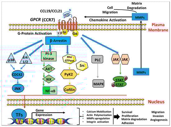 - Legler, D.F.; Uetz-von Allmen, E.; Hauser, M.A. CCR7: Roles in cancer cell dissemination, migration and metastasis formation. Int. J. Biochem. Cell Biol. 2014, 54, 78–82. [Google Scholar]