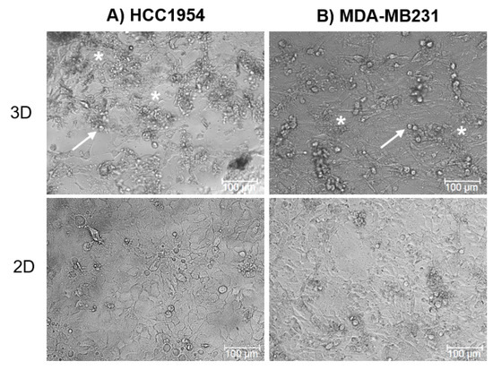 Cell morphology in 3D and 2D cultures. HCC1954 (A) and MDA-MB231 (B) 3D and 2D cell culture images acquired in a bright field. White arrows indicate cells, whereas white stars indicate the extracellular matrix deposed by cells. Data are from triplicate wells for each condition in two independent experiments. Scale bar 100 µm. Magnification 20×.