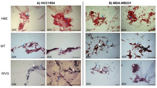Histological images of HCC1954 (A) and MDA-MB231 (B) cells cultured in the 3D scaffold for seven days. Representative images acquired by an inverted microscope after staining with Hematoxylin and Eosin (H&E), Masson Trichrome (MT), and Wiegert Van Gieson (WVG) methods. The blue arrows indicate cells, the white stars the extracellular matrix, and the white arrows indicate collagen. Data are from triplicate wells for each condition in two independent experiments. Scale bar 100 µm. Magnification 20× and 40×.