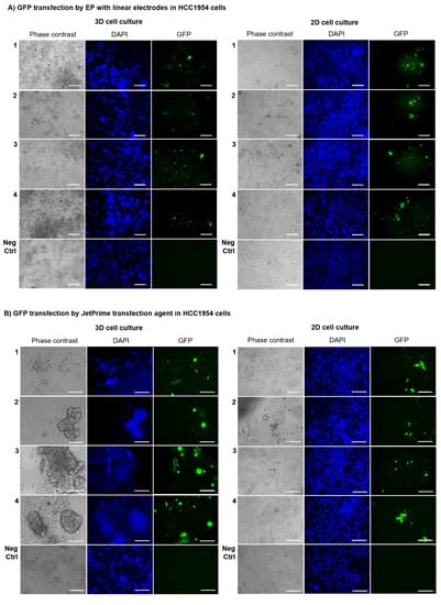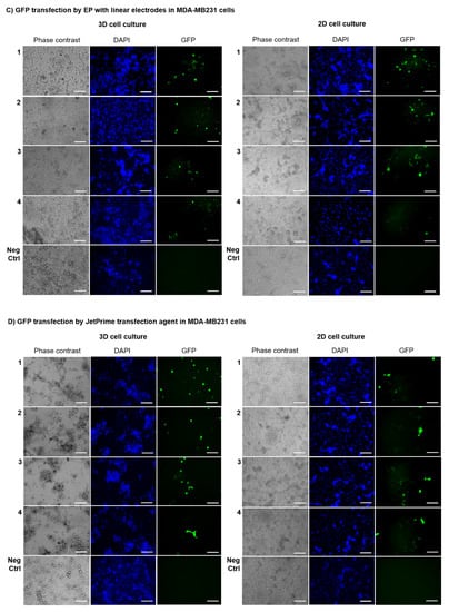 Efficiency of different Gene Electro-Transfer (GET) protocols in HCC1954 and MDA-MB231 cells according to the modality of cell culture (3D versus 2D). Cells were transfected with Electroporation (EP) employing linear electrodes or JetPrime® transfection agent. Representative fluorescence images of HCC1954 (A,B) and MDA-MB231 (C,D) 3D and 2D cell culture transfected with green fluorescent protein (GFP) by EP with linear electrodes (A,C) and by JetPrime® transfection agent (B,D). Representative micrographs of cells in bright field and using 4′,6-Diamidino-2-Phenylindole (DAPI) and GFP filters. Micrographs are representative of two separate blind experiments with similar outcomes. Not transfected cells are the Negative Control (Neg Ctrl). Observation at three days post-transfection. Magnification 20×. Scale bars, 100 µm.