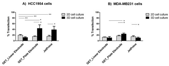 Moreover, no significant differences were observed between MDA-MB231 cells cultured in 2D or 3D system and treated with the GET protocol using linear electrodes (13% in MDA-MB231 3D cell culture versus 11% in MDA-MB231 2D cell culture, p not significant) (Figure 3C and Figure 4B). As positive control, the application of JetPrime® transfection to either HCC1954 or MDA-MB231 cells grown in 3D or 2D cultures gave a transfection efficiency of 16% in HCC1954 3D cell culture versus 19% in HCC1954 2D cell culture, p < 0.01, and 14% in MDA-MB231 3D cell culture versus 17% in MDA-MB231 2D cell culture, p < 0.01).