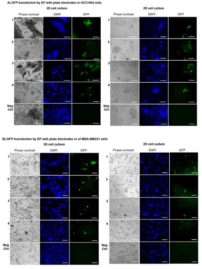 The efficiency of different GET protocols in HCC1954 and MDA-MB231 3D and 2D cell cultures transfected by EP with plate electrodes. Representative fluorescence images of (A) HCC1954 and (B) MDA-MB231 3D and 2D cell cultures transfected with GFP by EP with plate electrodes. Observation at three days post-transfection. Representative micrographs of cells in bright field and using DAPI and GFP filters. Micrographs are representative of two separate blind experiments with similar outcomes. Not transfected cells are the Negative Control (Neg Ctrl). Magnification 20×. Scale bars, 100 µm.