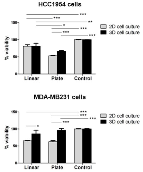 In particular, the viability of both HCC1954 and MDA-MB231 cells cultured in the 3D scaffold for three days after GET, performed using either plate (66% and 96%, respectively) or linear (81% and 86%, respectively) electrodes, was higher than viability in the correspondent 2D cell cultures using either plate (53% and 63%, respectively) or linear (81% and 65%, respectively) electrodes (p < 0.001 for the plate electrode; p < 0.01 for the linear electrode in MDA-MB231 cells). HCC1954 cells did not exhibit any difference between 3D and 2D cells viability. Moreover, the use of the linear electrode in HCC1954 cells was significantly associated with lower cell mortality in both 2D and 3D cell culture (p < 0.001 for 2D cell culture; p < 0.01 for 3D cell culture). In contrast, there were no significant differences in the viability of MDA-MB231 cells subjected to GET using either linear or plate electrodes.