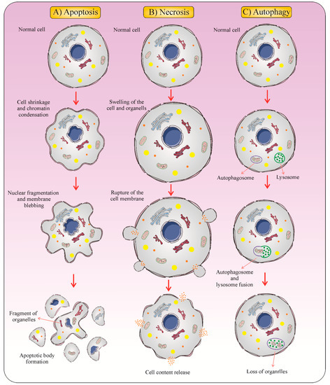 Three different forms of cell death. (A) Apoptosis is a form of cell death that some molecular mechanisms in a cell lead to its death. It is generally characterized by distinct morphological features including cell shrinkage, blebbing, and nuclear fragmentation. (B) Necrosis is a type of cell death that is morphologically described by an increasing translucent cytoplasm, swelling of organelles, and increased cell volume. (C) Autophagy is the major intracellular degradation process by which cytoplasm ingredients are translocated to and degraded in the lysosome.