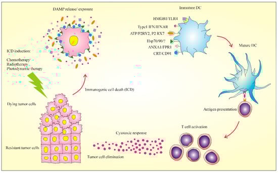 Immunotherapy has been considered as a promising therapeutic modality in oncology that aims to re-activate the immune system which is stopped by the tumor cells and creates a robust antitumor response [1]. Tumor cells, by having resistance to cell death and escaping from immunological surveillance, are durable in cancer patients [2]. So, restoring the susceptibility of cancer cells to death and intensifying immune recognition of poorly immunogenic tumor cells create strategies for therapeutic success [3]. The combination of these strategies, which would take advantage of the probable immunogenic traits of diverse forms of cancer cell death, is an interesting viewpoint [4]. The antitumor immune response can be provided by immunogenic cell death (ICD), a different class of cell death described by release or expression of calreticulin (CRT), adenosine triphosphate (ATP), high mobility group box 1 (HMGB1), heat-shock proteins (HSPs), ANXA1, and stimulation of type I interferon [5,6,7]. Binding of these danger-associated molecular patterns (DAMPs) to their receptors leads to immune cells’ recruitment and induction. Lastly, they lead to recognition, phagocytosis, and activation of T lymphocytes to eradicate cancer cells [8]. Up to now, some single-agent ICD inducers have been introduced, comprising standard chemotherapeutics, targeted anticancer factors, and numerous other treatment options [9,10]. It was documented that the immunogenicity of tumor cells can be promoted by particular treatments (e.g., chemotherapy, radiotherapy, and photodynamic therapy) and leads to antitumor immunity [11,12]. Here, we summarized the well-characterized DAMPs and discuss in detail the different inducers of ICD.