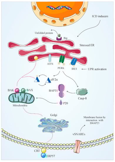 The disulphide isomerase ERp57 constitutes an element of the pre-apoptotic pathway that participates in the appearance of CRT on the surface of dead cells that are treated with specific types of anticancer agents [55]. Both CRT and ERp57 are synthesized and collected in the lumen of the ER and are usually presented at the surface of cells subjected to ICD [52]. Cells that lack the ERp57 cannot precede chemotherapy-induced ICD because they are unable to expose CRT and, hence, fail to stimulate an immune response [199]. On the other side, the depletion of CRT could suppress ERp57 exposure [199]. These data demonstrate that ERp57 is requisite for the exposure of CRT and vice versa. Brefeldin A, (i.e., blocker of anterograde protein transport) contributes to the efficacy of chemotherapy by inhibition of pathways of ER-Golgi protein traffic [55]. The effects of brefeldin A on protein transport blocks translocation of CRT/ERp57 complex in murine CT26 colon cancer cells treated with anticancer agents, such as oxaliplatin, anthracyclines, or UVC light, and, accordingly, the potential of CT26 cells to immunize mice against tumor development in vivo after anthracycline treatment was destroyed in the presence of brefeldin A [55]. Moreover, the secretory route from the Golgi apparatus to the plasma membrane has been demonstrated to employ the molecular interactions between the synaptosomal-associated protein (SNAP) proteins and the respective plasma-membrane associated receptors SNAREs. Defect in SNAREs prevents the surface expression of CRT [200] and RNA interference targeting SNARE-based exocytosis resulted in reduced capacity of cancer cells incubated with anthracyclines, oxaliplatin, or UVC light to induce protective immunity in vivo. The depletion of SNAP23/25 did not have a profound impact on eIF2a phosphorylation, caspase-8 activation, and BAP31 cleavage, underscoring that the ER stress and apoptotic machinery work upstream of CRT/ERp57 co-translocation [201]. In this regard, the TAT protein of HIV1 has been shown to disrupt the intracellular transport of proteins via miRNA-mediated downregulation of SNAP25 in neurons [202].