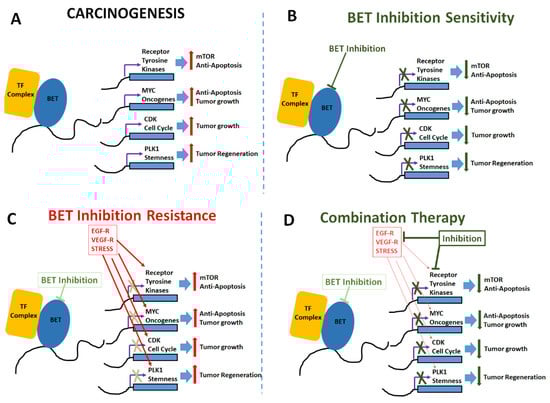 - Rathert, P.; Roth, M.; Neumann, T.; Muerdter, F.; Roe, J.S.; Muhar, M.; Deswal, S.; Cerny-Reiterer, S.; Peter, B.; Jude, J.; et al. Transcriptional plasticity promotes primary and acquired resistance to BET inhibition. Nature 2015, 525, 543–547. [Google Scholar] [CrossRef]