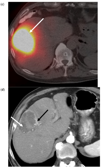 Radiation segmentectomy treats ≤2 hepatic segments using a lobar dose, with the goal of “curative” or ablative therapy, by permitting even higher doses of radiation to the liver tumor and minimizing the risk of nontarget embolization [22]. For example, recorded median doses to the tumor range from 536–1200 Gy, whilst limiting the median dose to the treated segment to 210–254 Gy [22,23]. This has been correlated with efficacious tumor necrosis [22,23,24,25]. Growing data and experience has led to the adoption of SIRT as the first-line transarterial locoregional treatment at some centers and suggests further validation as a viable treatment in localized early stage or very early stage HCC, not amenable to percutaneous ablation [26,27]. Figure 4 contains selected images from a 90Y radiation segmentectomy using glass microspheres. Figure 4c confirms delivery of the therapeutic agent to the desired location. Figure 4d demonstrates the gradual involution of tumor, which may not be immediately evident on early post-procedure imaging, as there are areas of residual enhancement.