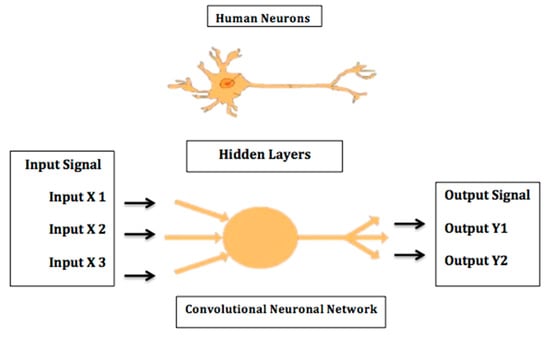 ML frameworks have evolved considerably over the past few decades. Traditional methods include algorithms such as support vector machine (SVM), neural network (NN), logistic regression, random forest, and naïve Bayes. On the other hand, modern deep learning (DL) methods include convolutional neural networks (CNN or ConvNet), recursive neural networks, long short-term memory (LSTM), deep belief networks, convolutional deep belief networks, Boltzmann machines, stacked auto-encoders, tensor deep stacking networks, spike-and-slab RBMs, compound hierarchical-deep models, deep coding networks, deep q-networks, encoder–decoder networks, and multilayer kernel machine. DL algorithms are based on the artificial neural network principle, which emulates the structure and the function of human brain neurons (Figure 1). The neural network consists of thousands of layers of neurons, with each group of neurons that correspond to a certain layer receiving input from neurons of the underlying layer. Neurons subsequently use supervised, unsupervised, or semi-supervised learning to detect certain characteristic and pathognomonic features that are then stacked together and fine-tuned to generate a new output transmitted to the next layer [,].