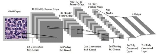 Processing pipeline of a convolutional neural network for the detection of visual categories in images. Example of a CNN model proposed previously by other authors. The convolutional layers perform feature extraction consecutively from the image patch to higher-level features. The pooling layers reduce image size by subsampling. The last fully connected layers provide prediction based on the given features. Reproduced with permission from Hanadi El Achi [].