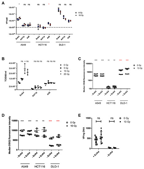 To initially assess whether we could potentiate EnAd particle production and replication using radiation, we measured virus genome copy numbers in irradiated versus non-irradiated A549, DLD-1 and HCT116 cells using qPCR. These cell lines were selected to evaluate radiation’s effect on virus at varying levels of radiosensitivity, A549 and DLD-1 cells being radioresistant, while HCT116 cells are radiosensitive [47,48,49]. Cells were mock-infected or infected at an MOI of 0.1 with EnAd-SA-GFP, Ad11p or Ad5. At 24 h post-infection, plates were mock-irradiated or irradiated at 10 Gy. At 72 h post-infection, we observed an increase in viral genome copy number in EnAd-infected, irradiated A549 cells versus infected, non-irradiated cells (Figure 1A), indicative of an increase in genome production rather than an increase in genome release alone. These findings were not seen for other virus serotypes or cell lines. In fact, there was a significant decrease in irradiated, Ad5-infected HCT116 cells.