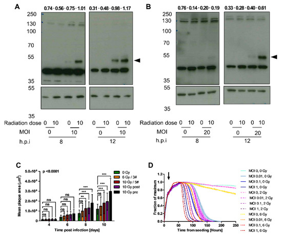 A strong induction of E1A expression was observed in cells irradiated at 10 Gy 24 h prior to infection compared to non-irradiated cells (Figure 2A,B). This effect was seen in both A549 (Figure 2A) and HCT116 cells (Figure 2B), at both 8 and 12 h p. i. This result suggests that radiation may improve or accelerate virus replication in irradiated cells through an E1A-dependent mechanism.