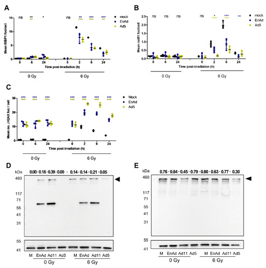 53BP1 phosphorylation has been shown to be inhibited by E4ORF4, part of the adenovirus E4 early transcriptional unit [55]. Ad5 and Ad11p both encode for functional E4ORF4, while E4ORF4 is truncated in EnAd. To explore whether 53BP1 phosphorylation is inhibited in cells infected with EnAd, A549 cells were infected with 100 PFU/cell of EnAd-SA-GFP, Ad11p, or Ad5, to enable study of potential effects after a single round of infection. At 22 h post-infection, cells were irradiated or mock-irradiated. At 24 h post-infection, lysates were probed for phosphoSer1778-53BP1 and total 53BP1 expression. Irradiation was timed two hours prior to harvesting to coincide with the expected peak of p53BP1 foci formation. Phosphorylation of 53BP1 on Ser1778 was observed in cells infected with EnAd or Ad11p, but not Ad5, regardless of target cell radiation (Figure 3D,E and Figure S5). As expected based on previous literature, 53BP1 phosphorylation increased after irradiation of mock-infected cells. In addition to the expected 53BP1 band at around 450 kDa, we also observed a band of around 60 kDa in group B adenovirus-infected samples (EnAd and Ad11p). This band could indicate a cleavage or degradation product of 53BP1, potentially a result of incomplete degradation due to differences in E4 between group B and C adenoviruses, but not due to a lack of functional E4ORF4. This phosphorylation and cleavage pattern was also observed in HCT116 cells when this experiment was repeated with mock, EnAd or Ad5 infection (Figures S3 and S8).