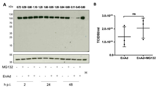 DNA ligase IV is another component of the DDR machinery. Published data has shown that the decrease in DNA ligase IV following infection is proteasomally mediated in Ad5-infected cells [23]. DNA ligase IV is thought to be targeted by a E3 ubiquitin ligase complex of E4ORF3, E4ORF6, and E1B-55K. We therefore investigated whether this was also the case for EnAd. A549 cells were infected with EnAd-SA-GFP at 200 VP/cell or mock-infected. At 2 h p. i., cells were treated with the proteasome inhibitor MG132 or a DMSO vehicle control. A decrease in DNA ligase IV is seen at 48 h p. i. in EnAd-infected cell lysates. This decrease is partially abrogated by treatment with MG132 (Figure 4A and Figure S6). The addition of the proteasome inhibitor MG132 does not lead to a significant change in infectious particle production, as measured by TCID50 (Figure 4B). This indicates that EnAd also mediates DNA ligase IV degradation through the proteasome, though it is still unclear whether this involves adenovirus E3 ubiquitin ligase complexes as with Ad5.