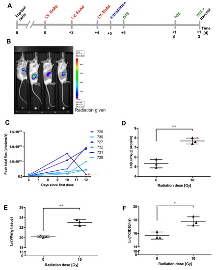HCT116 cells (2 × 106/mouse) were injected subcutaneously into six SCID mice. When the resulting tumours reached a volume of 50 mm3, all mice were given three injections i.v. of 0.5 × 1010 VP EnAd-SA-Firefly Luciferase (EnAd-SA-Fluc) intravenously 48 h apart, mirroring the virus dosing schedule and route of administration used in the Phase I clinical trial [38,43] and to minimise the risk of tumour ulceration that may occur following injection and irradiation of the same area using intratumoural administration. One day following the final virus dose, mice were randomised to receive either 10 Gy of irradiation to the tumour or to remain non-irradiated, in keeping with the dose and time point found to have a significant impact on virus production in vitro. At 6, 10 and 12 days after the first dose of EnAd-SA-Fluc (corresponding to 1, 5, or 7 days post-irradiation), mice received a subcutaneous dose of luciferin and underwent imaging using the IVIS to assess intratumoural luciferase expression. Tumours were harvested at a pre-determined time point 12 days after the first dose of virus (corresponding to 7 days post-irradiation). Weight and tumour volume were regularly monitored throughout the experiment. Figure 5A summarises the experimental timeline.