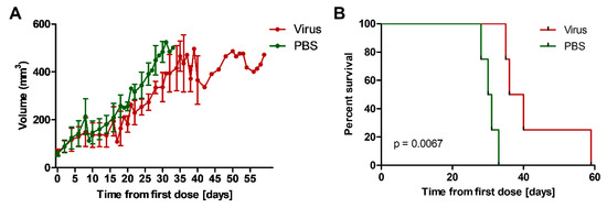 - Geoerger, B.; Grill, J.; Opolon, P.; Morizet, J.; Aubert, G.; Lecluse, Y.; Van Beusechem, V.W.; Gerritsen, W.R.; Kirn, D.H.; Vassal, G. Potentiation of radiation therapy by the oncolytic adenovirus dl1520 (ONYX-015) in human malignant glioma xenografts. Br. J. Cancer 2003, 89, 577–584. [Google Scholar] [CrossRef][Green Version]