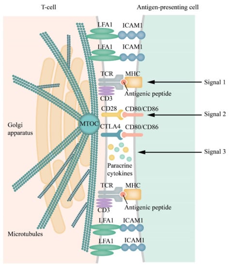 Activation of T cells requires three signals (Figure 1). The first signal is delivered through the interaction of T cell receptors (TCRs) with their antigen exposed on the surface of antigen-presenting cells (APCs) complexed with the proteins of the major histocompatibility complex (MHC). The second signal is antigen-independent and is delivered through the interaction between the stimulatory receptor C28 on the T cells and the protein CD80 (B7.1) or CD86 (B7.2) on the APCs []. The B7 family includes important membrane-bound ligands able to bind both co-stimulatory and co-inhibitory receptors (mentioned below). Stimulatory cytokines deliver the third signal in synapses. T cells, fully activated by all three signals, begin to proliferate and destroy carriers of antigens presented by the APCs. Apart from the co-stimulatory signals for T cells, there are also co-inhibitory signals produced by the T cells shortly after the initiation of the T cell proliferation [,,]. Inhibitory interactions prevent overactive responses to the immune stimuli, thereby preventing autoimmune reactions.