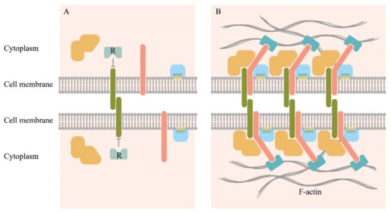 Schematic representation of individual molecules freely diffusing on the membrane surface (A), and a cluster of the intercellular adhesive complexes (B). Adhesion molecules (deep green) initiate binding, which also may involve other transmembrane proteins (pink), cytoplasmic proteins that can bind to the cytosolic part of the transmembrane proteins (orange). It also involves lipid groups present on the inner surface of the plasma membrane (yellow), and proteins with lipid-binding domains (light blue). Clustering may lead to the displacement of negative regulators associated with the cytosolic part of the adhesion molecules (R). Actin microfilaments stabilize macromolecular clusters through actin-binding proteins (cyan) [].