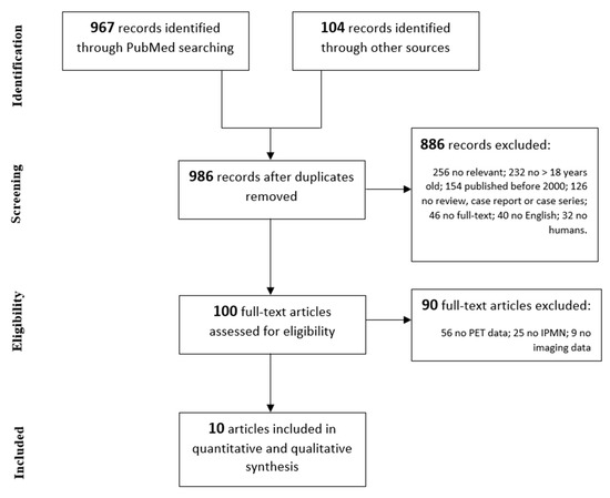 Overall, 986 records were identified. After screening the titles and abstracts according to our inclusion and exclusion criteria, 100 full-text articles were assessed for eligibility and 10 studies [15,16,17,18,19,20,21,22,23,24] were ultimately included in our critical appraisal (Figure 1). Patients’ data were collected and analyzed on the basis of their radiological or metabolic diagnostic findings.
