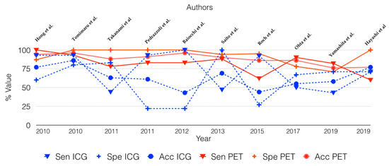 In the present literature review, PET achieved an overall sensitivity, specificity, and accuracy of 80%, 94%, and 87%, respectively. Unlike those of the ICG criteria, these values have remained constant over the years, and in the various studies reviewed, whatever the time of publication and standard radiological criteria adopted (Figure 2). The better performance of PET is also supported by a superior PPV (94.4% vs. 66.1%) and NPV (82.2% vs. 59.3%). The positive and negative likelihood ratios of 18-FDG PET (16.6 and 0.2) highlight a much stronger association of 18-FDG PET with the presence/absence of the disease than ICG criteria (1.6 and 0.6).