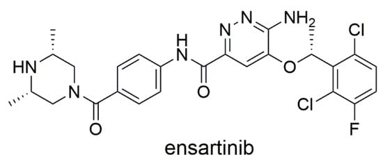 Lung cancer is a major cause of cancer deaths in both genders, with the non-small cell lung cancer (NSCLC) subtype accounting for almost 85% of all lung cancer cases [1]. It has traditionally been treated with non-selective cytotoxic drugs that cause severe harm to physiological tissues. These agents are gradually being replaced by novel targeted therapies that selectively affect cancer-specific regulatory pathways, dramatically improving the safety of anticancer treatment [2]. At present, the most clinically successful group of targeted drugs are tyrosine kinase inhibitors (TKIs) and therapeutic antibodies. Ensartinib (X-396) is a third-generation TKI (Figure 1) that is a potent inhibitor of mutated anaplastic lymphoma kinase (ALK); deregulation of this enzyme has been found to be a meaningful target in 3–7% of all NSCLC cases [3]. Ensartinib is currently undergoing phase II and III clinical trials for the treatment of NSCLC [4]; preclinical investigations have shown that it is more active than the approved ALK inhibitors crizotinib, alectinib, and ceritinib and that it retains activity even in models with ALK mutations that confer resistance to these agents [5].