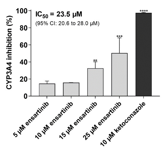 Effect of ensartinib on human CYP3A4-mediated metabolic activity in HepG2-CYP3A4 cells. Cells were pre-incubated with the tested drugs for 10 min, then the reaction was initiated by adding the substrate (luciferin-IPA). The reaction was stopped after 45 min and the samples’ luminescence was measured to assess the cells’ viability. Metabolic data were normalized to viability values to compensate for possible inaccuracies caused by non-uniformity in cell growth and/or false-positive results due to drug cytotoxicity. The viability values were then re-normalized as inhibition percentages. The plotted values are means ± SD based on three independent experiments. Statistical analysis was performed using background-subtracted luminescence data normalized to viability values using one-way ANOVA followed by Dunnett’s post hoc test (** p < 0.01; *** p < 0.001; **** p < 0.0001 compared to respective vehicle control).