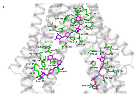 - Ferreira, R.J.; Ferreira, M.J.; dos Santos, D.J. Molecular docking characterizes substrate-binding sites and efflux modulation mechanisms within P-glycoprotein. J. Chem. Inf. Model. 2013, 53, 1747–1760. [Google Scholar] [CrossRef]
