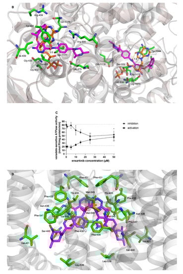 We performed molecular docking simulations to characterize the molecular background of the interactions between ensartinib and ABCB1, ABCG2, and CYP3A4. Flexible molecular docking was performed into all three ligand binding sites of the inward-facing form of the ABCB1 transporter: the modulator site (M-site), a rhodamine-binding site (R-site), and a hoechst site (H-site) [28]. Ensartinib is best fitted to the M-site (−12.6 kcal/mol), where it is surrounded by protein residues Leu-65, Phe-336, Ile-340, Phe-343, Gln-347, Gln-725, Phe-728, Ala-729, Phe-732, Ser-979, Phe-983, Met-986, and Gln-990; it binds to the R- and H-sites with lower affinities (-9.3 and −9.5 kcal/mol, respectively) (Figure 5A). Ensartinib is also known to interact with the ATP-binding pocket of anaplastic lymphoma kinase (ALK) [29]. Therefore, to test the possibility that ensartinib might interfere with the ATP-binding pocket of ABCB1’s nucleotide binding domains (NBDs), we also performed flexible docking into this site. Docking results indicated that ensartinib binds to the ATP-binding pocket with an energy of −10.6 kcal/mol and may thus compete with ATP and thereby influence ABCB1 efflux activity (Figure 5B). This conclusion was further supported by the results of ABCB1 ATPase assay as ensartinib significantly decreased verapamil-stimulated ATPase activity of ABCB1. In addition, ensartinib also significantly increased baseline vanadate-sensitive ATPase activity, which suggest that it could be a substrate of ABCB1 (Figure 5C).