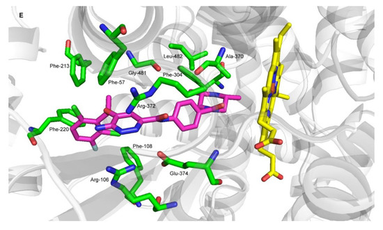 A flexible molecular docking study was also performed to study the binding interactions of ensartinib with CYP3A4. The crystal structure of CYP3A4 containing ketoconazole was downloaded, ketoconazole was removed, and ensartinib was docked into its position, revealing that it has a high predicted affinity for CYP3A4 (−10.6 kcal/mol) (Figure 5E).
